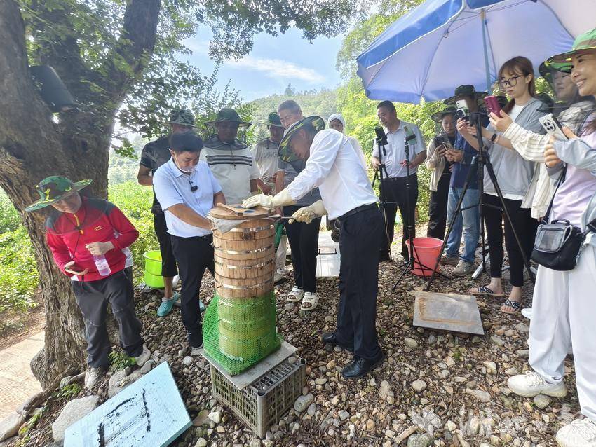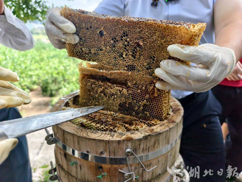 湖北日报客户端讯(通讯员望作信)8月25日,夷陵区畜牧兽医服务中心在龙泉古木中蜂养殖专业合作社,举办中蜂割蜜现场观摩会,通过“线下观摩+线上直播”模式,为当地土蜂蜜打开销路,破解“好蜜藏深山、真假难分辨”的市场难题。